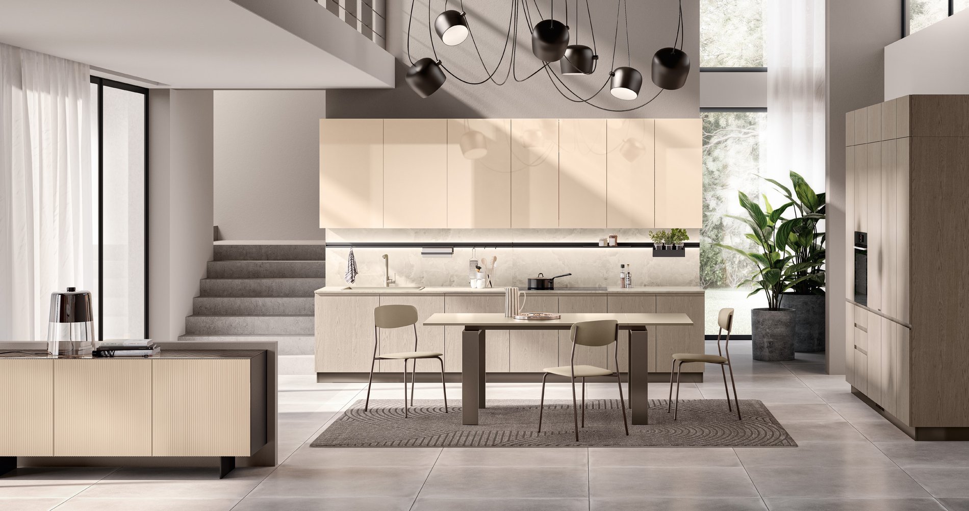 Il design è essenziale ma ricco di dettagli distintivi: apertura dell’anta senza maniglia, reinterpretazione dell’anta in vetro, geometrie studiate per cassetti e volumi, nuove isole e penisole che diventano fulcro della convivialità. Le finiture – laccate lucide o opache e decorative con finitura a registro – sono proposte in una gamma cromatica sofisticata e contemporanea, pensata per ambienti dal gusto internazionale.